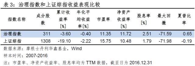 研究小组通过分析上市公司的数据,以及上交所公司治理委员会的评估结果,考察了公司治理因素对投资收益的影响。上证公司治理指数自2007年成立到2016年末累积收益率为-4%,上证综指同期收益率为-19%。上证公司治理指数和大盘相比获得了15%的超额收益率。治理指数年化收益率-0.40%,高于上证综指基准的-2.22%;风险调整收益率(夏普比率)0.65,高于基准的-0.19(见表3)。结果证明在投资中纳入公司治理要素可以显著提升投资绩效。