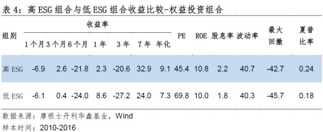 ESG三要素的综合绩效:研究小组构建了高、低ESG评级的投资组合,结果表明两种组合均对资产管理者的投资业绩有正向作用,评级越高的组合具有更高的超额收益率。