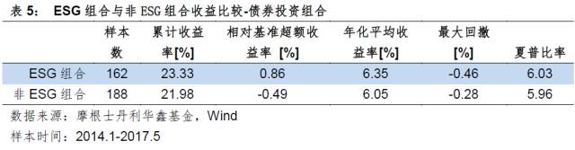 在固定收益实证研究方面,研究小组构建了ESG组和非ESG组两个投资组合,二者的初始久期、债券级别分布较为接近。E、S、G的要素值分别根据发债人所处行业、募集资金用途、公司是否入选上证公司治理指数等相关信息来确定。模拟组合的测试结果显示,2014年1月-2017年5月,ESG组合年化收益率比非ESG组合高0.30%,累计收益率比行业基准中债信用债总财富指数高0.86%。ESG组合与非ESG组合的夏普比率较为接近,但最大回撤大于非ESG组合(见表5)。